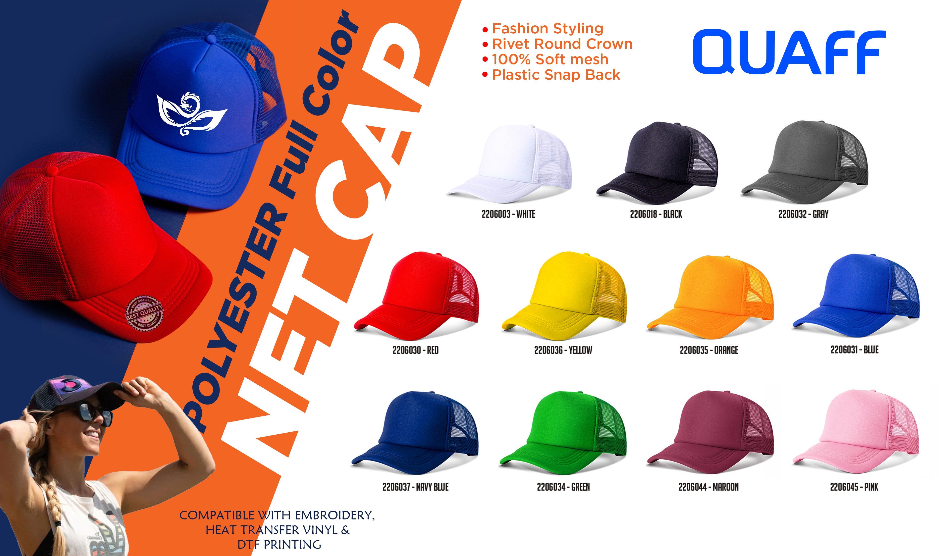 Full Color QUAFF Printable Mesh Cap for Men and Women Baseball Cap / Net Trucker Black Blue Red