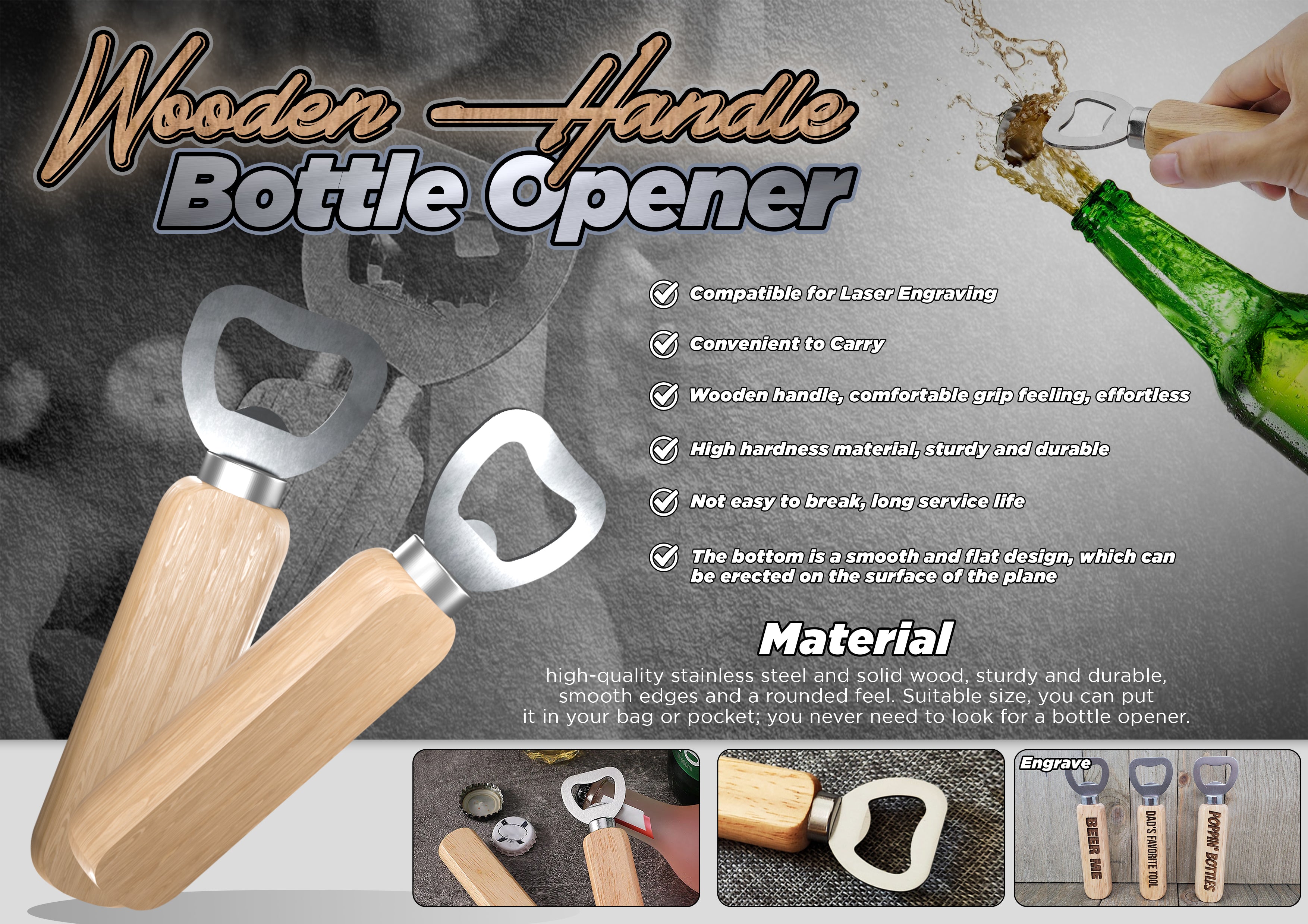 Wooden Handle Stainless Steel Bottle Opener is made of high quality stainless steel and solid wood, sturdy and durable, smooth edges and a rounded feel. Suitable size, you can put it in your bag or pocket. You never need to look for a bottle opener.